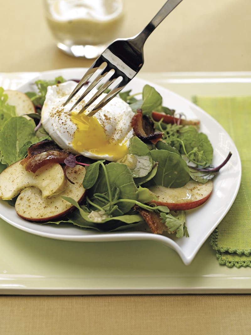 read more >: Mixed Greens with Bacon and Poached EggThis recipe takes the classic French bistro salad and gives it an innovative twist with Chinese Five Spice-scented apples and candied bacon.