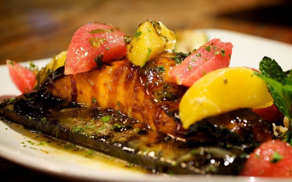 read more >: Cedar Planked Salmon with Sake Soy and Molasses GlazeIn this recipe from the Bluewater Grill in Tustin, Calif., salmon is seared in sake and soy, marinated with a fruit Beurre Blanc, grilled and served on a cedar plank.